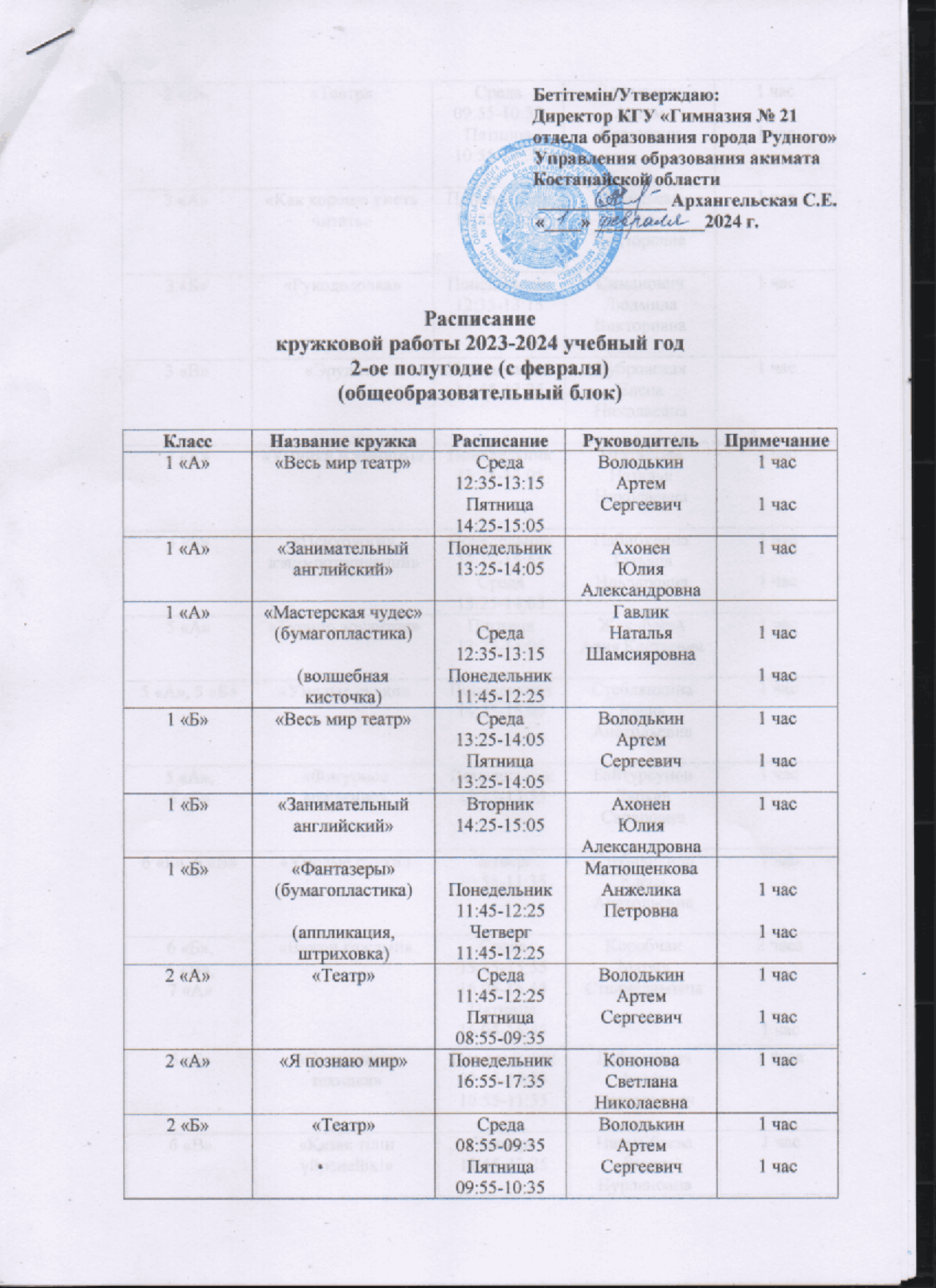 Расписание кружковой работы на 2 полугодие 2023 — 2024 учебного года