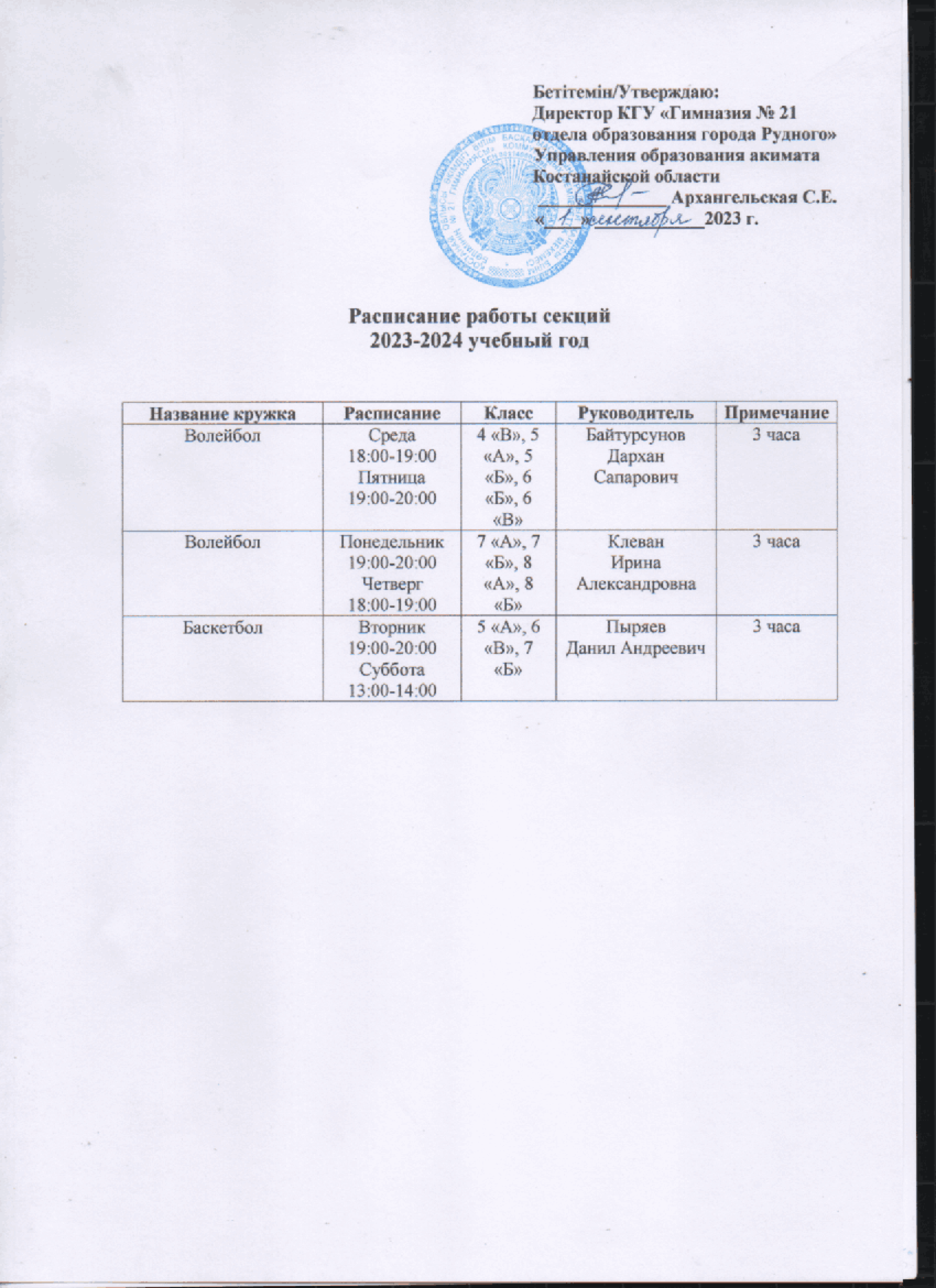 Расписание спортивных секций на 2023 — 2024 учебный год