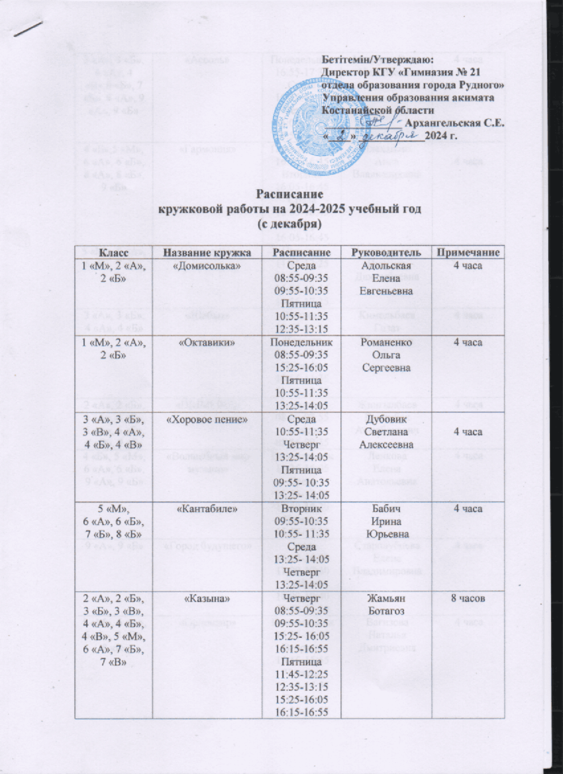 Расписание кружковой работы на 1 полугодие 2024 — 2025 учебного года