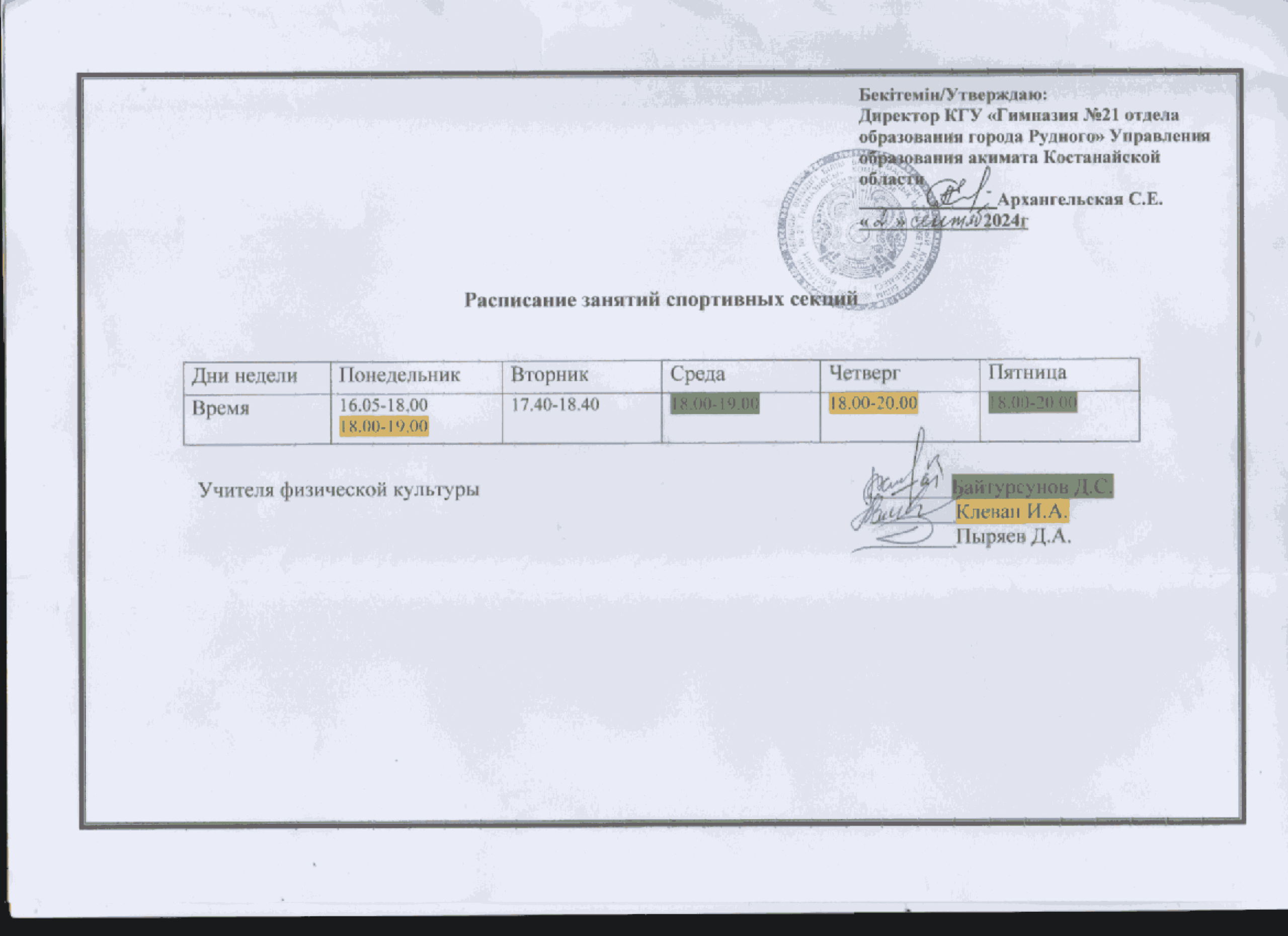 Расписание спортивных секций на 2024 — 2025 учебный год